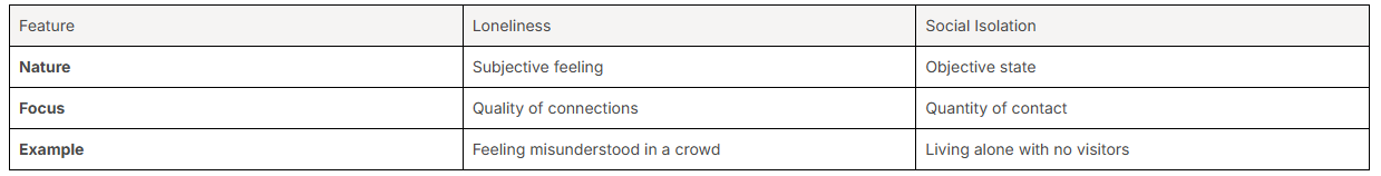 Loneliness is a subjective, internal feeling of being disconnected or that your social needs are not being met. It’s about the quality of your connections. Social isolation, on the other hand, is an objective, external state of having minimal contact with other people. It’s about the quantity of your connections.